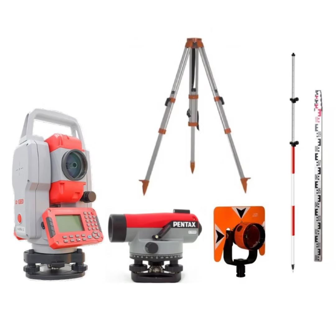 Estación total electrónica NUEVA marca Alpha-Geo modelo Alpha X con teclado alfanumérico y pantalla de cristal líquido ilumínale EN AMBOS LADOS, con interface para comunicaciones USB y Bluetooth (opcional), compensador líquido, lectura electrónica de ángulos con resolución en pantalla de 1″ (UN SEGUNDO), con índice del ángulo horizontal seleccionable, escalas angulares en mils, gons, grados o por ciento de pendiente seleccionable, memoria interna que permite registrar más de 120,000 puntos de medición y con puerto USB para descarga de datos, medición electrónica de distancias de 1,000m sin prisma y 5,000 metros con 1 prisma en condiciones atmosféricas favorables con una resolución de 0.001 m. y una aproximación de ± (2mm + 2ppm x D) mm, corrección interna de la refracción y curvatura de la tierra seleccionable, corrección atmosférica y constante de prisma, telescopio completamente rotable con iluminación de retícula, cuenta con programas internos (cálculo de coordenadas por radiación, replanteo, elevación remota, resección, etc.)